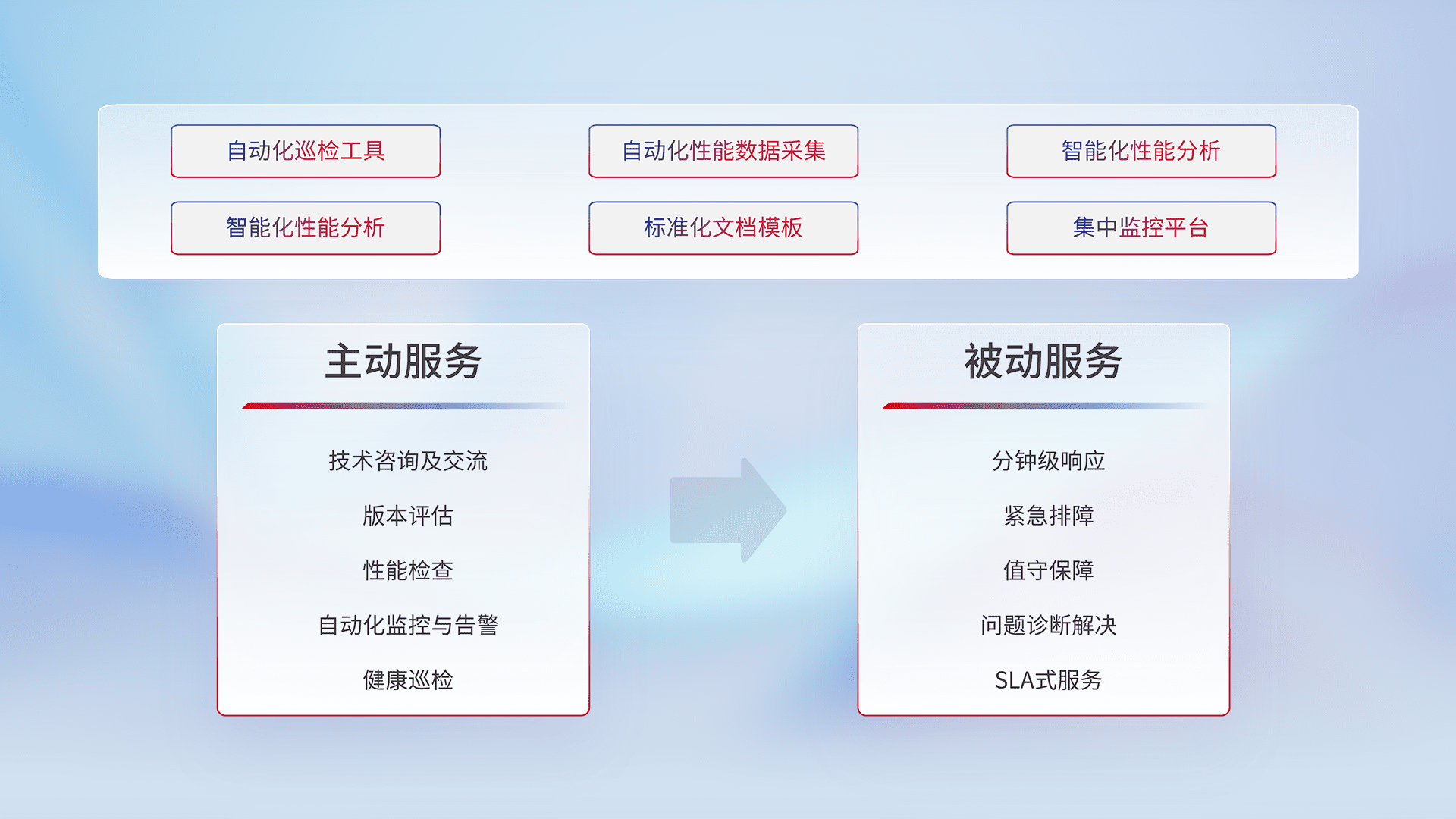 智能化工具和标准化文档,,,保障服务质量,,,,提供主动服务(包含技术咨询、、、、版本评估、、、性能检查、、自动化监控与告警、、健康巡检)和被动服务包含(分钟级响应、、紧急排障、、值守保障、、、问题诊断解决、、、、SLA服务)。。